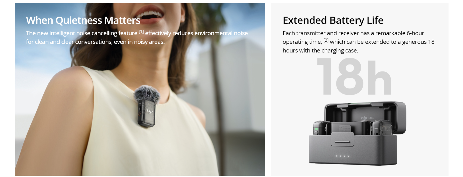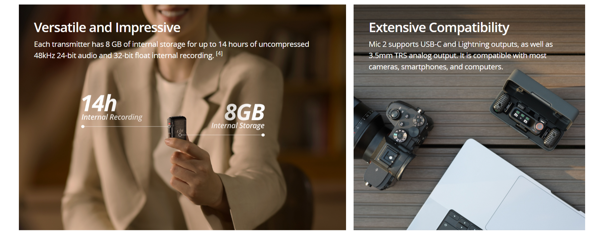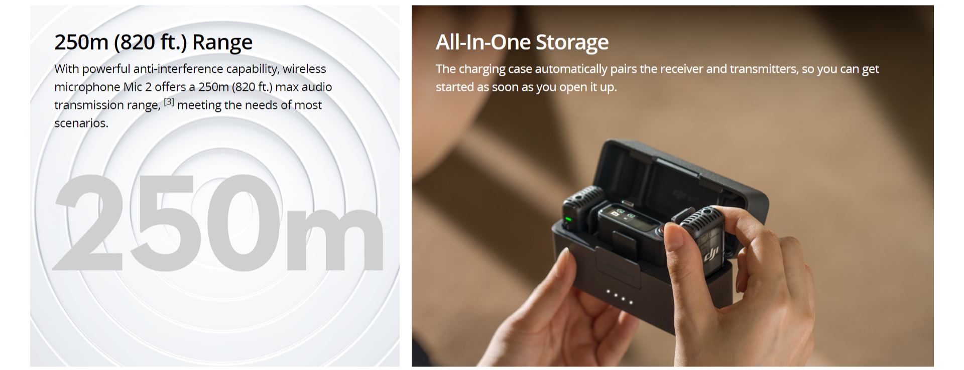 Don't let shoddy sound ruin your content. The DJI Mic 2, with its omnidirectional audio recording, is just the thing for vlogs and interviews. It can even pick up when more than one person is talking or handle the uproar of a concert. It's ready to go in an instant too - the mic automatically powers on when you open the charging case. Each transmitter has 8 GB of storage on-board, so can save up to 14 hours of audio. They can also double as standalone voice recorders or audio backup. With a wireless range of 250 m you can wander all you like. It will still transmit the audio back to the receiver, while anti-interference keeps the signal strong in busy city centres.