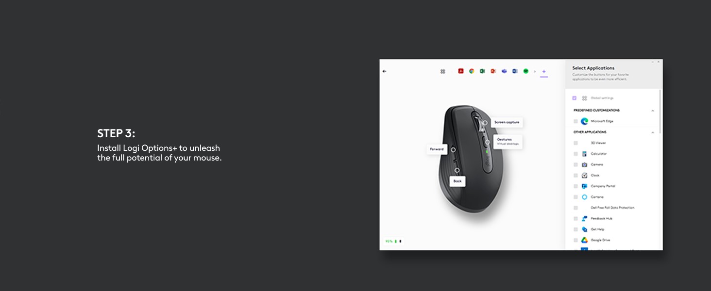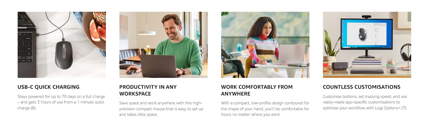 • Optimise Your Workflow: Work across devices, set tracking speed, customise buttons and use ready-made app-specific customisations with Logi Options+