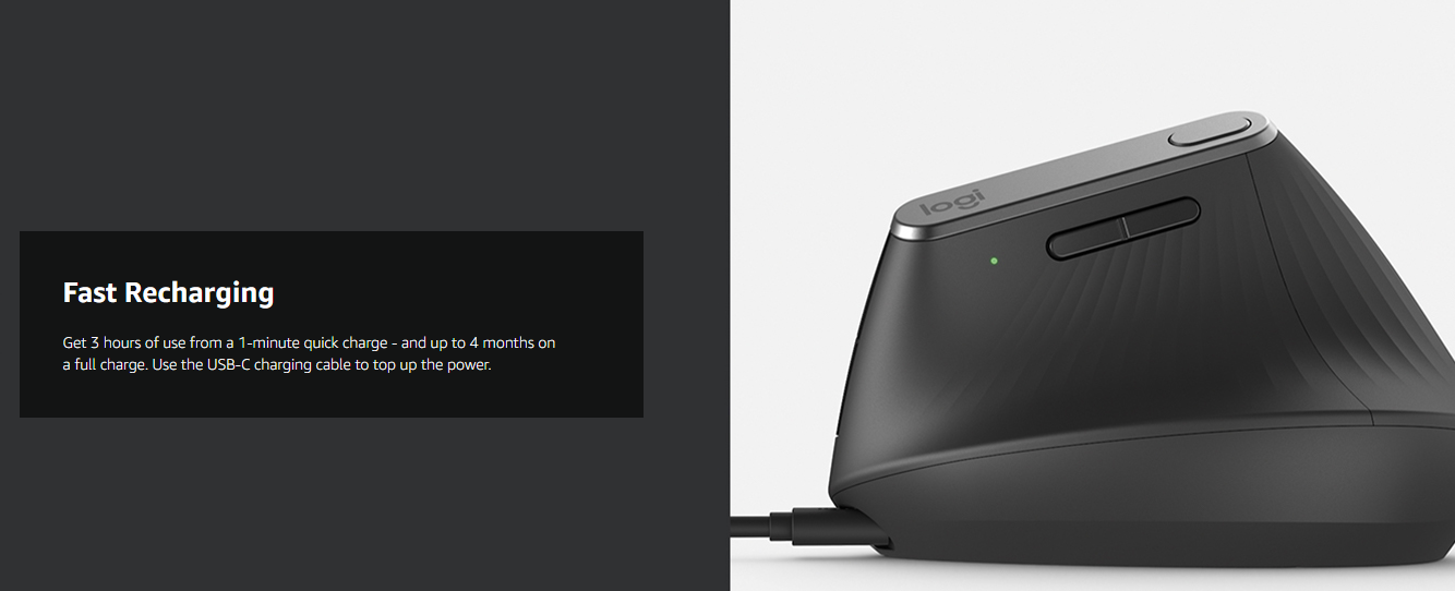 • Rechargeable battery with Quick-Charging : MX Vertical wireless ergonomic mouse stays powered for up to four months on a full charge – and gets up to three hours of use from a one-minute quick charge