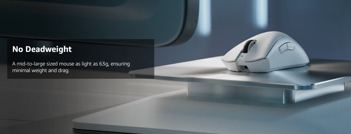 - 63g / 64g Ultra-lightweight Design No deadweight: Made more than 25% lighter than the Razer DeathAdder V2 Pro, enjoy a level of speed and control favored by the world’s top players with one of the lightest ergonomic esports mice ever created.