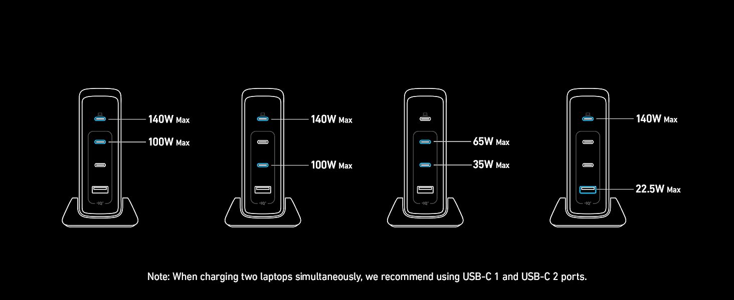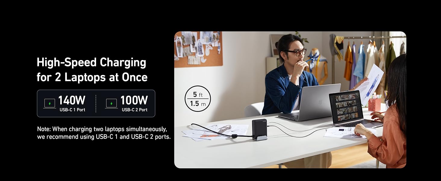 - Dual Laptop Fast Charging: Power two laptops at the same time, with the USB-C 1 port delivering 140W, and the USB-C 2 port providing 100W.