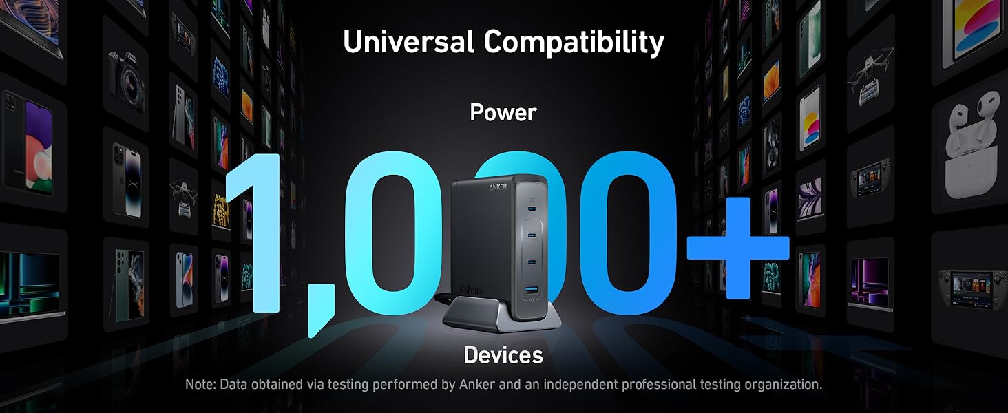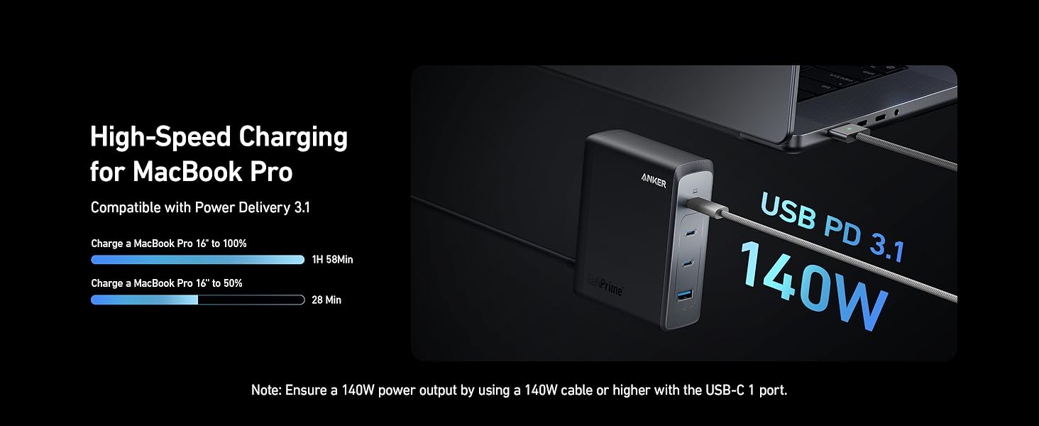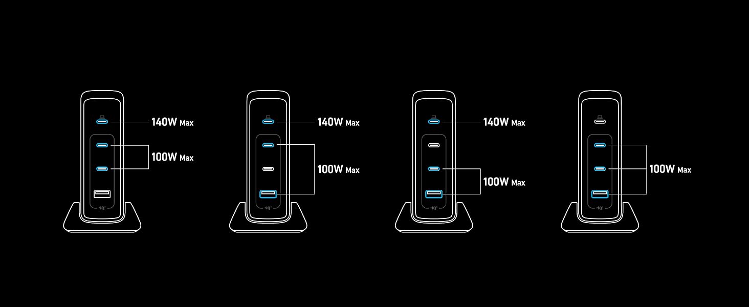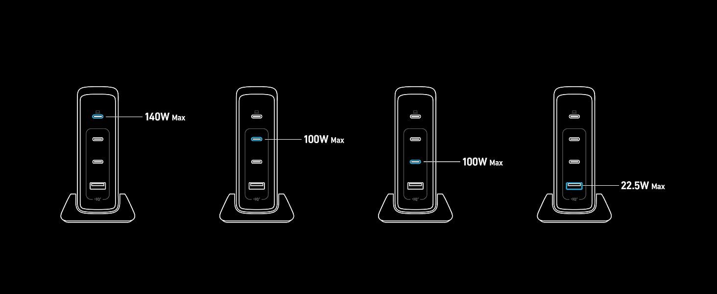- Unleash 240W of Super Power: With one USB-C port providing up to 140W, and the other three ports sharing 100W, charge up to 4 devices simultaneously with a maximum output of 240W.