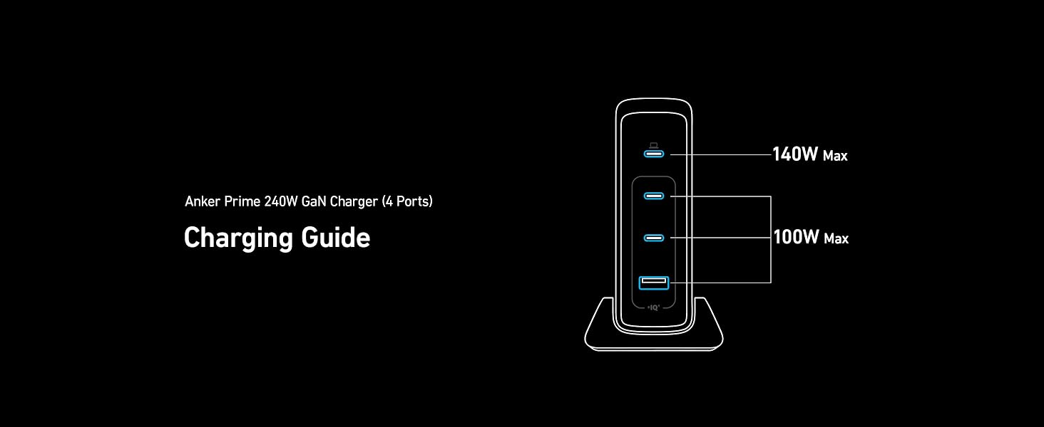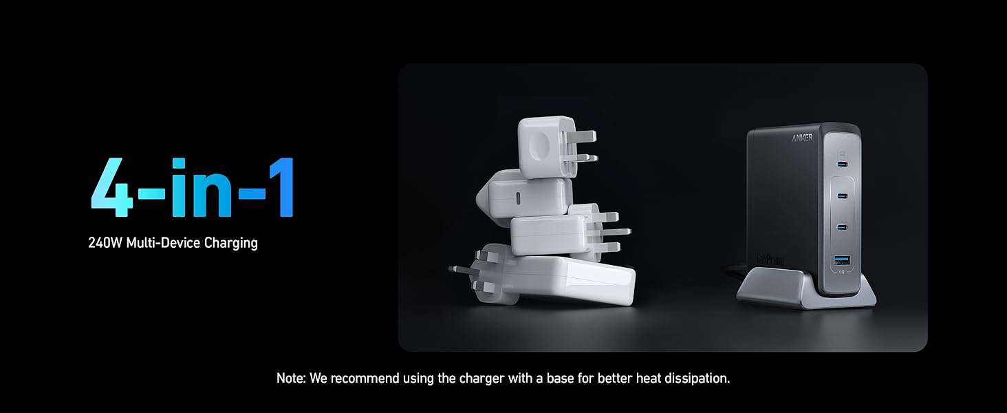 - What You Get: Anker Prime 240W GaN USB-C Charger (4 Ports), detachable base, welcome guide, our 24-month quality assurance, and friendly customer service.