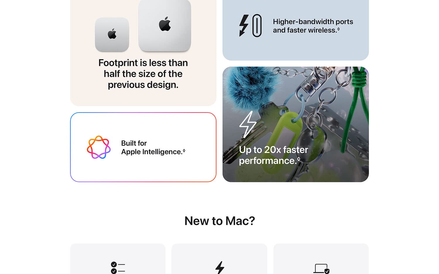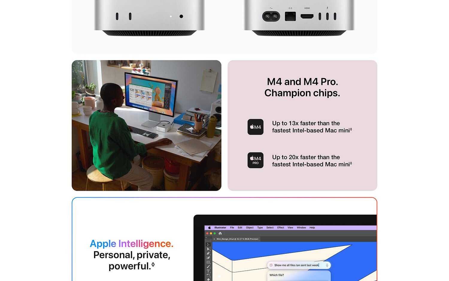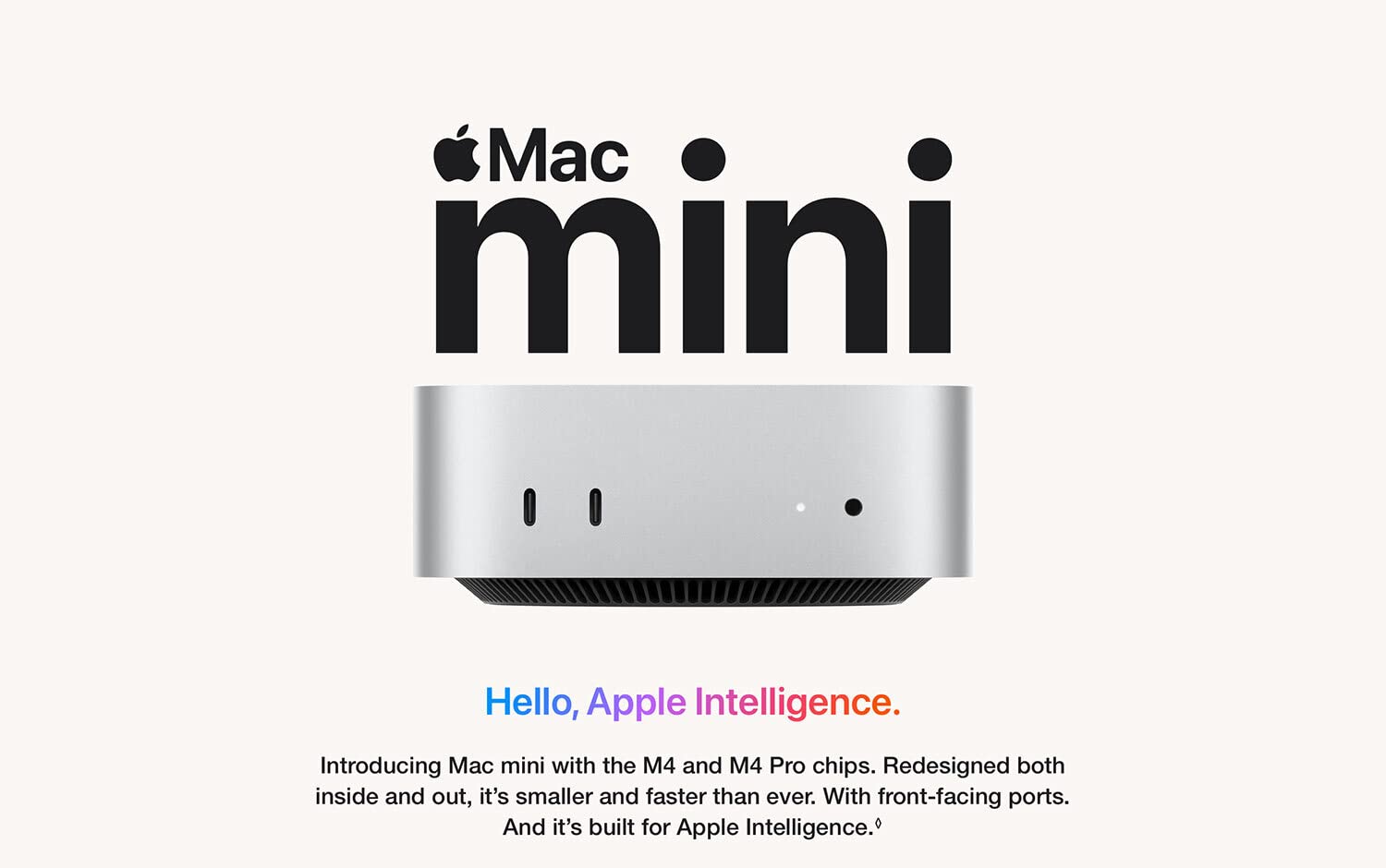 • SIZE DOWN. POWER UP — The far mightier, way tinier Mac mini desktop computer is five by five inches of pure power. Built for Apple Intelligence.* Redesigned around Apple silicon to unleash the full speed and capabilities of the spectacular M4 chip. With ports at your convenience, on the front and back.
