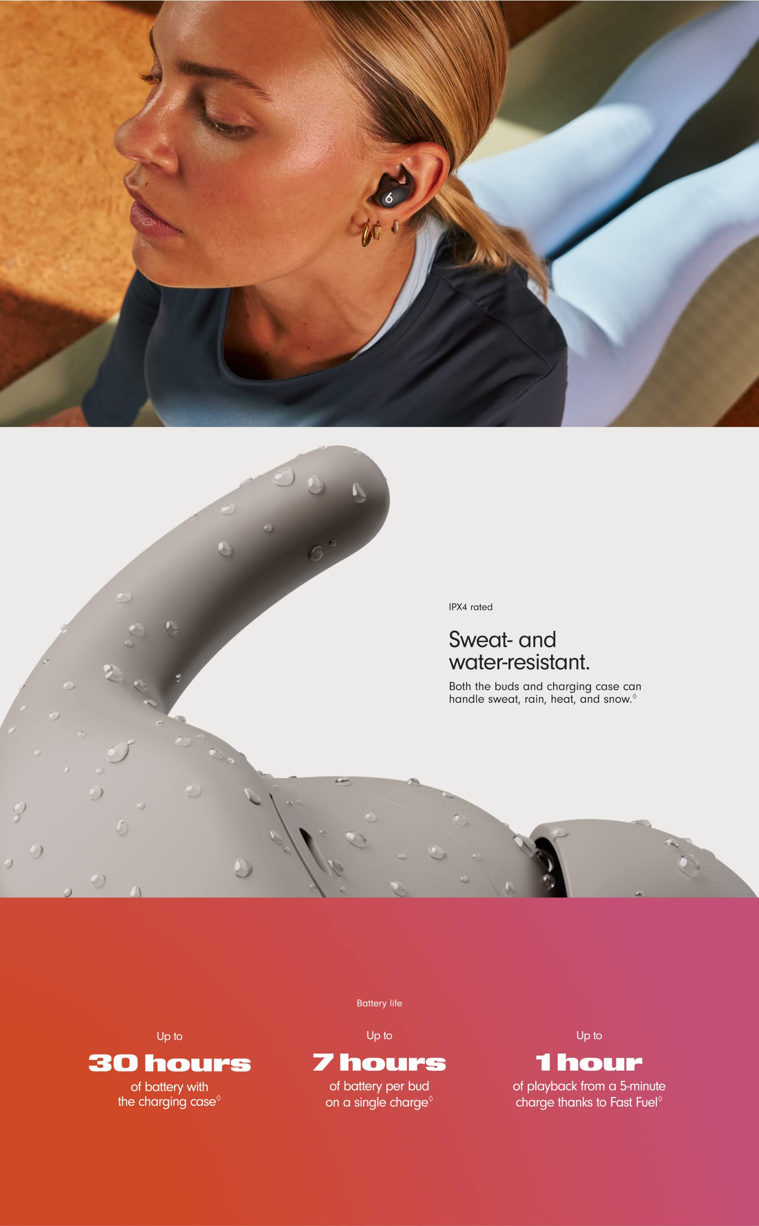 • IPX4 sweat and water resistance to handle intense workouts in the rain, heat or snow. The charging case is 17% smaller than its predecessor. The case is also sweat and water resistant with an IPX4 rating.