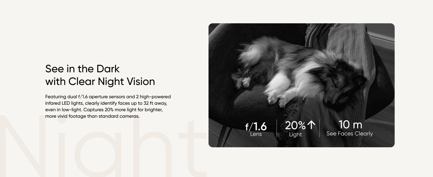 • Exceptional Night Vision: With an f/1.6 aperture sensor and 2 high-powered infared LED lights, faces can be seen clearly up to 32 ft away, even in low-light conditions.