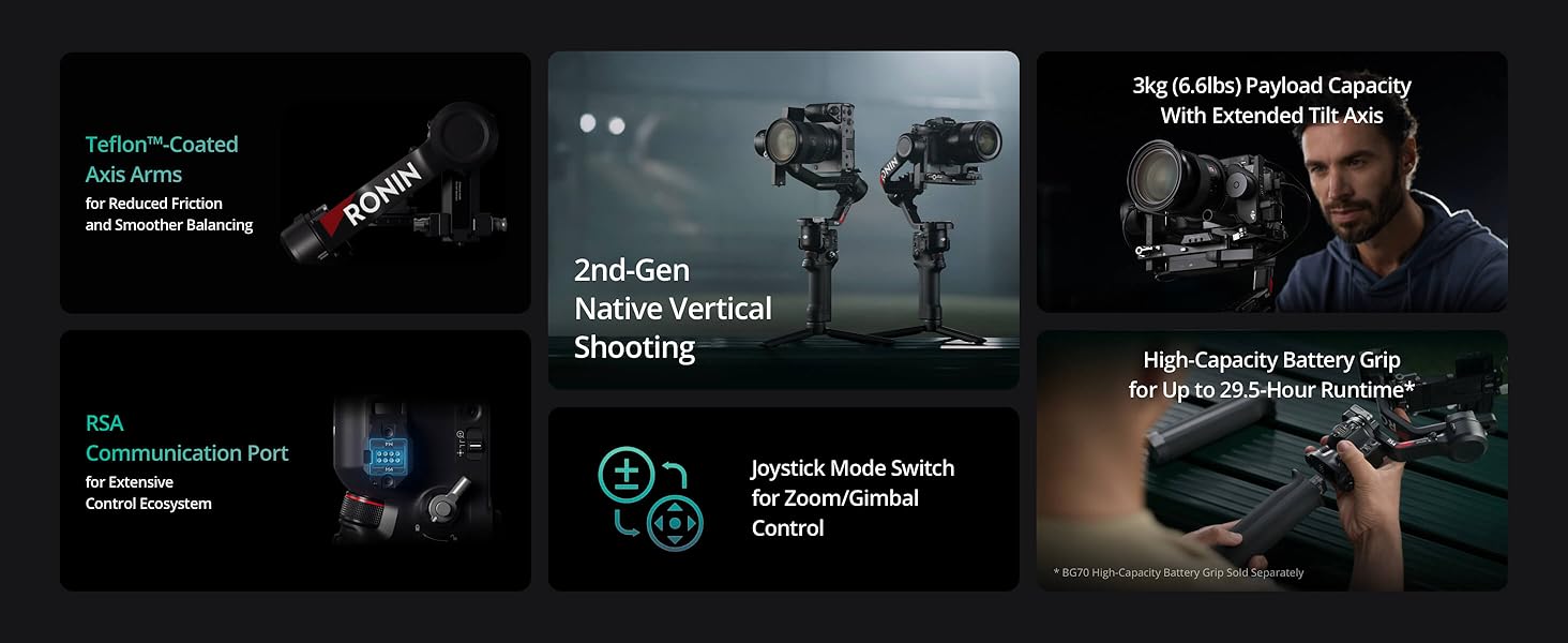 • New BG70 High-Capacity Battery Grip (Sold separately) - Extend RS 4's battery runtime from 12 hours to 29.5 hours. The grip also supports powering your camera and accessories with up to 18 watts via the USB-C port at the bottom.