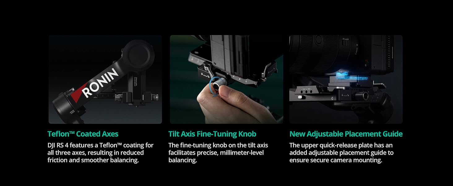 • Teflon - Coated Axis Arms for Smoother Balancing - DJI RS 4 features a Teflon coating for all three axes, resulting in reduced friction and ultra-precise balancing.
