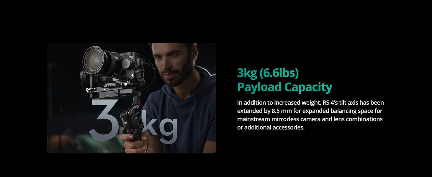 • 3kg (6.6lbs) Payload Capacity With Extended Tilt Axis -Compared with the previous generation, RS 4's tilt axis has been extended by 8.5 mm, offering expanded balancing space. Mount mainstream mirrorless camera and lens combinations and more.
