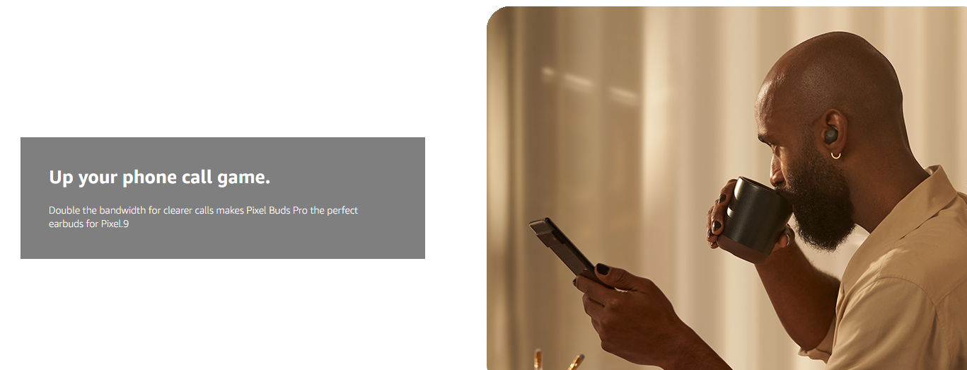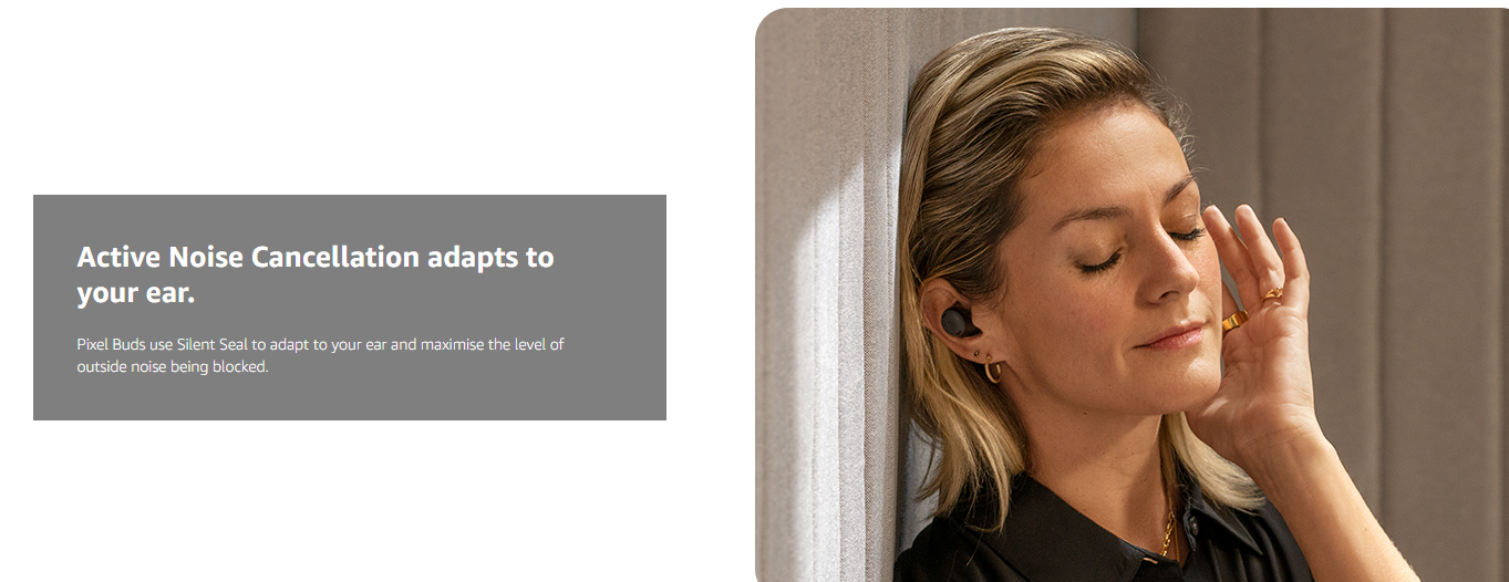 • Pixel Buds Pro use Active Noise Cancellation with Silent Seal to adapt to your ear and help block outside sounds, creating a quiet foundation so your music can shine.