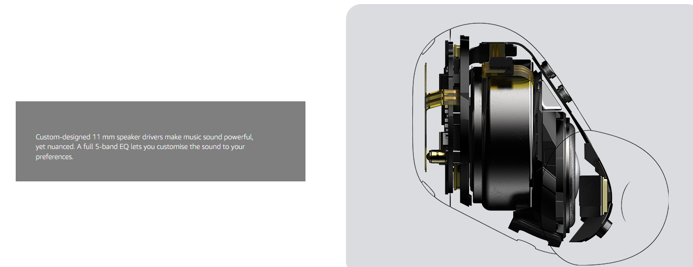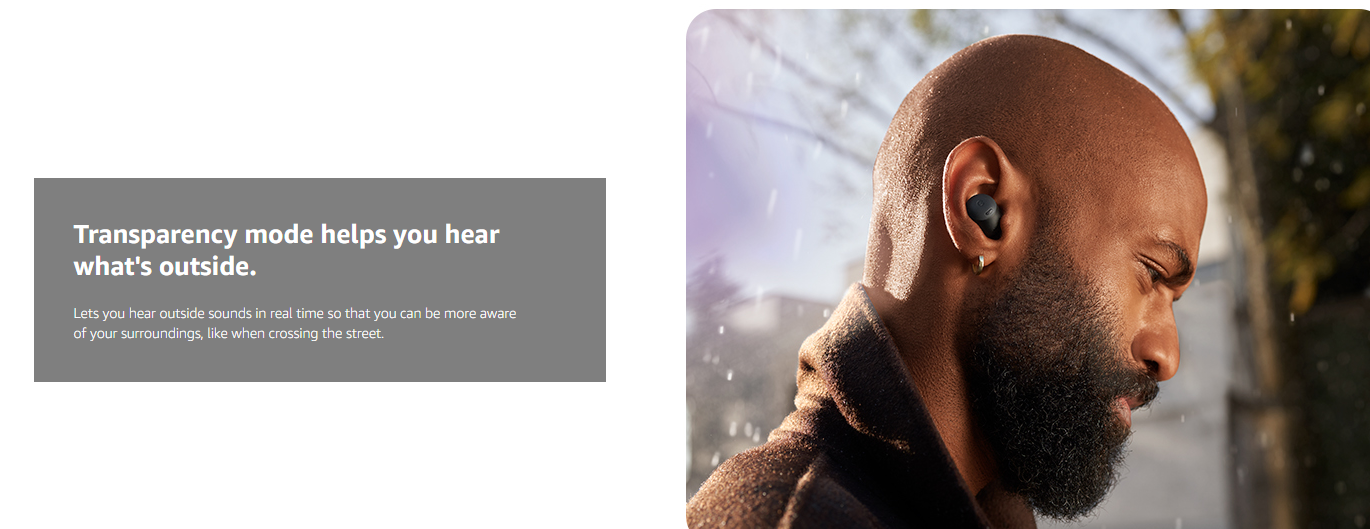 • Transparency mode helps you hear outside sounds in real time so you can be more aware of your surroundings, like when crossing the street