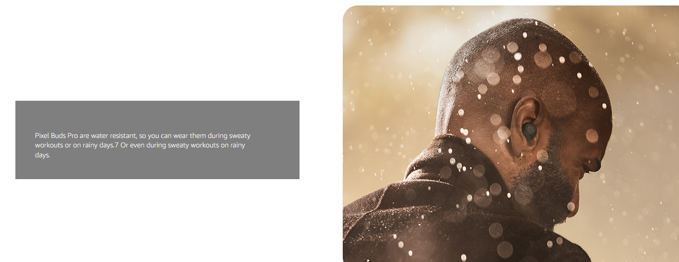 • Pixel Buds Pro are water resistant, so you can wear your earphones during sweaty workouts or on rainy days