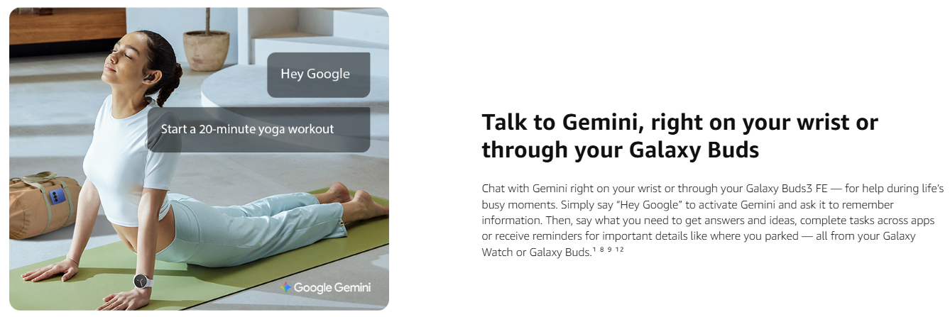 • TALK TO GEMINI THROUGH YOUR GALAXY BUDS: Chat with Gemini right on your wrist or through your Galaxy Buds3 FE, for help during life’s busy moments; Simply say “Hey Google” to activate Gemini and get answers