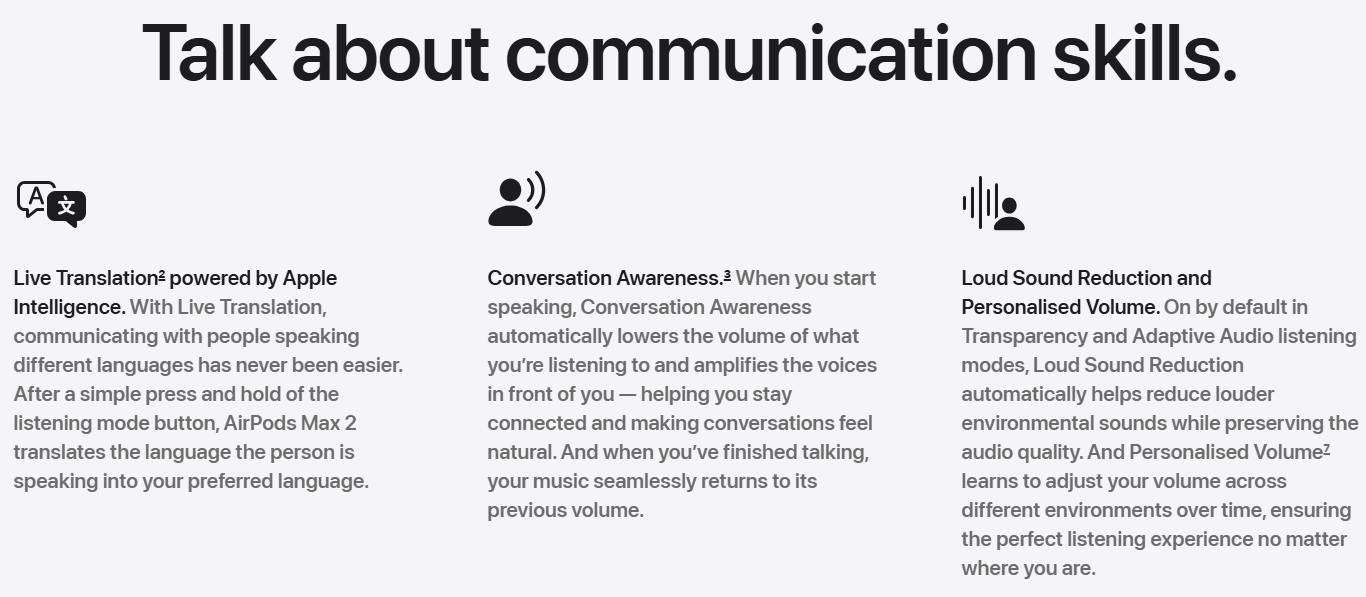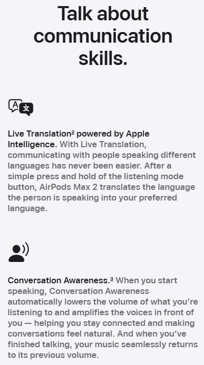 • LIVE TRANSLATION — Instantly translate conversations with Apple Intelligence when paired with a supported device.