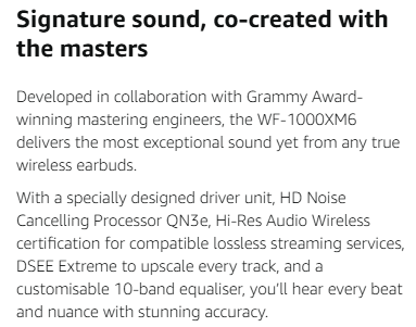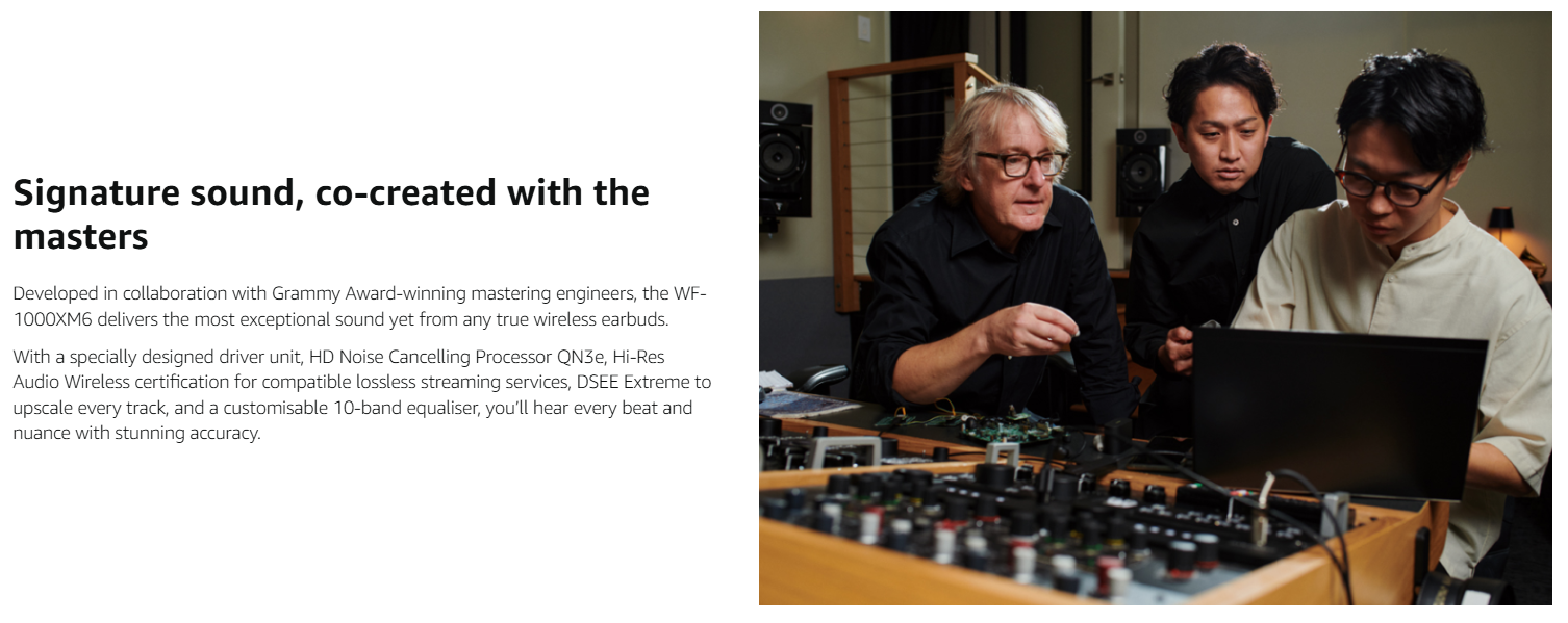• SIGNATURE SOUND, CO-CREATED WITH THE MASTERS: Developed in collaboration with Grammy Award-winning mastering engineers, with new driver unit, Hi-Res Audio Wireless, DSEE Extreme, and 10-band EQ