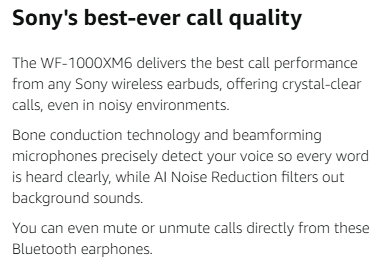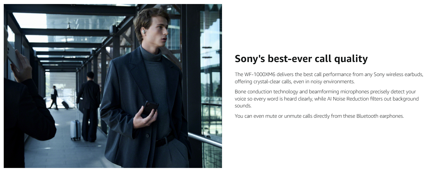 • SONY’S BEST-EVER CALL QUALITY: Bone conduction technology and beamforming mics detect your voice, while AI Noise Reduction filters out background sounds; Mute/unmute calls directly from earphones