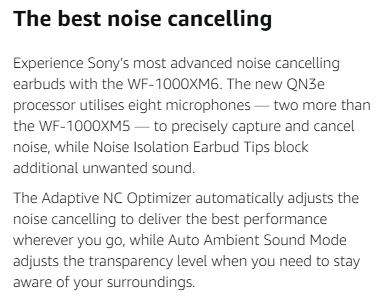 • THE BEST NOISE CANCELLING: New QN3e processor utilises 8 mics (2 more than WF-1000XM5), with Noise Isolation Earbud Tips, Adaptive NC Optimizer, and Adaptive Ambient Sound Mode when you need to stay aware