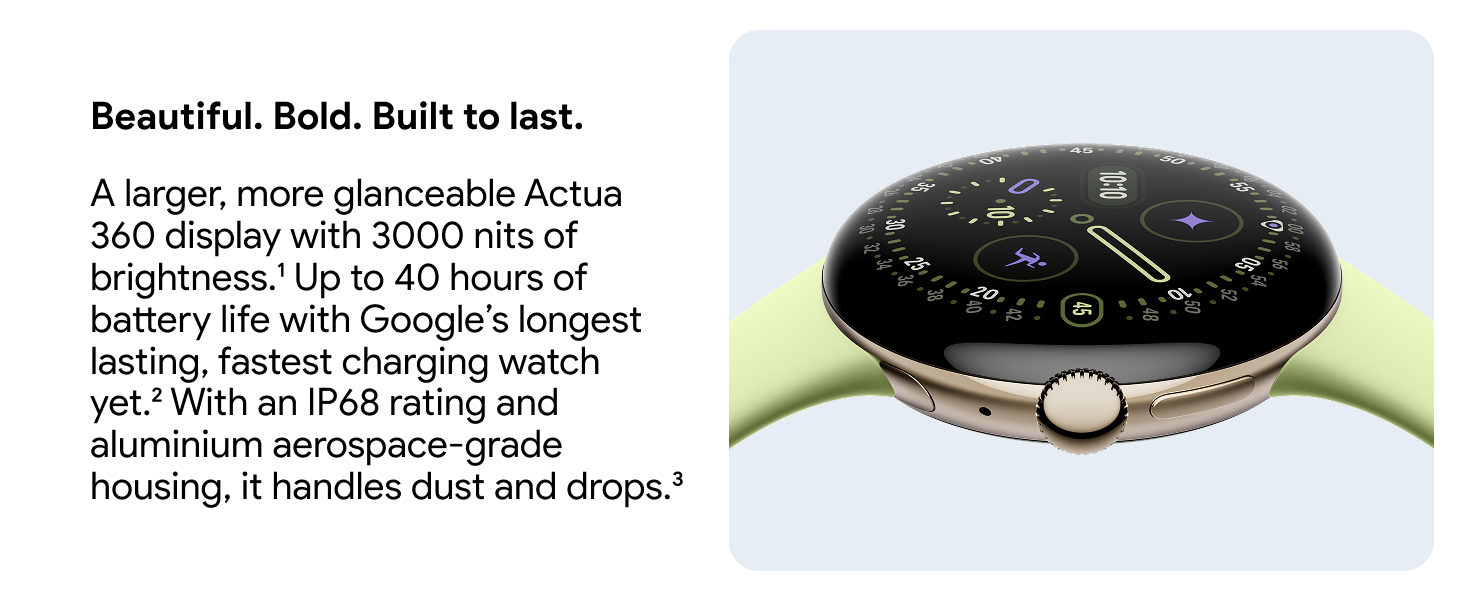 • Longest lasting. Fastest charging. With 25% faster charging and Google’s longest battery life yet, the Pixel Watch 4 is ready when you are.