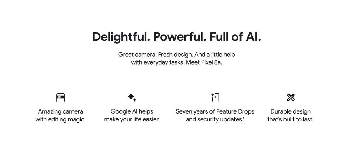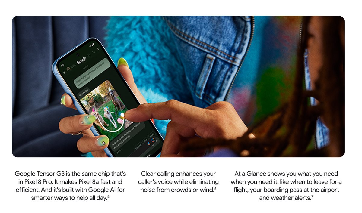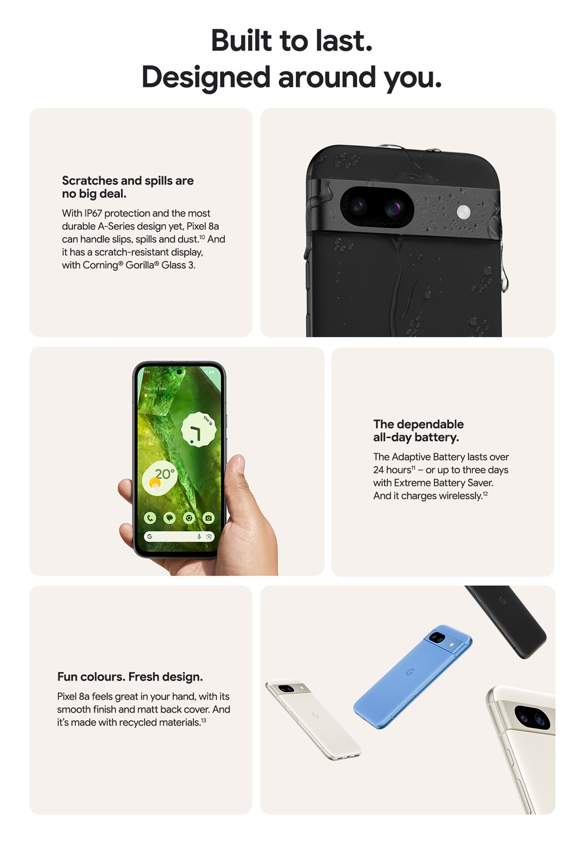 Meet the Pixel 8a, engineered by Google. Take amazing photos with the Pixel Camera. Do more, even faster with Google AI – like fix blurry images, screen calls and learn new things. Plus, it's built to last.