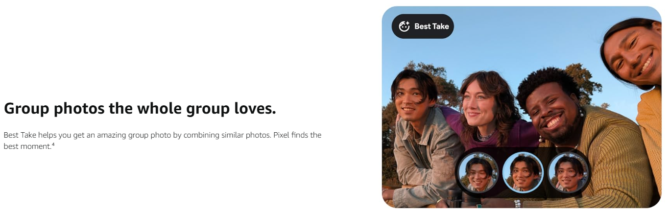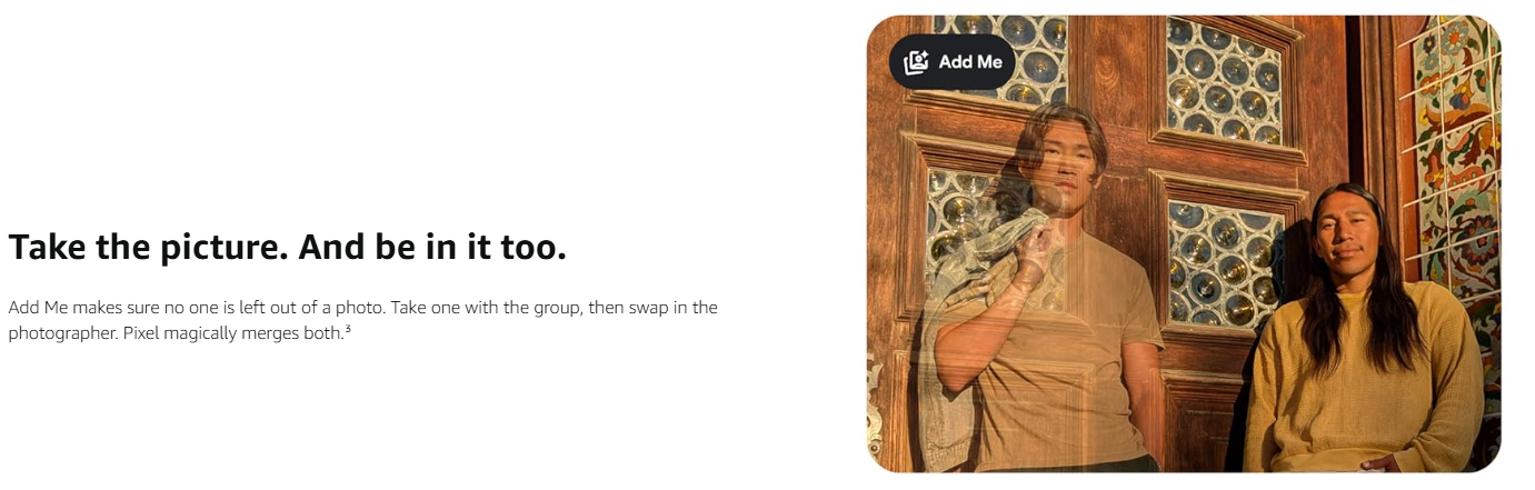 • Take the picture. And be in it too. Add Me makes sure no one is left out of a photo. Take one with the group, then swap in the photographer. Pixel magically merges both.