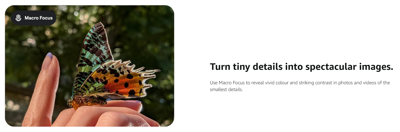 • Turn tiny details into spectacular images. Use Macro Focus to reveal vivid colour and striking contrast in photos and videos of the smallest details – like raindrops, flowers or sprinkles.