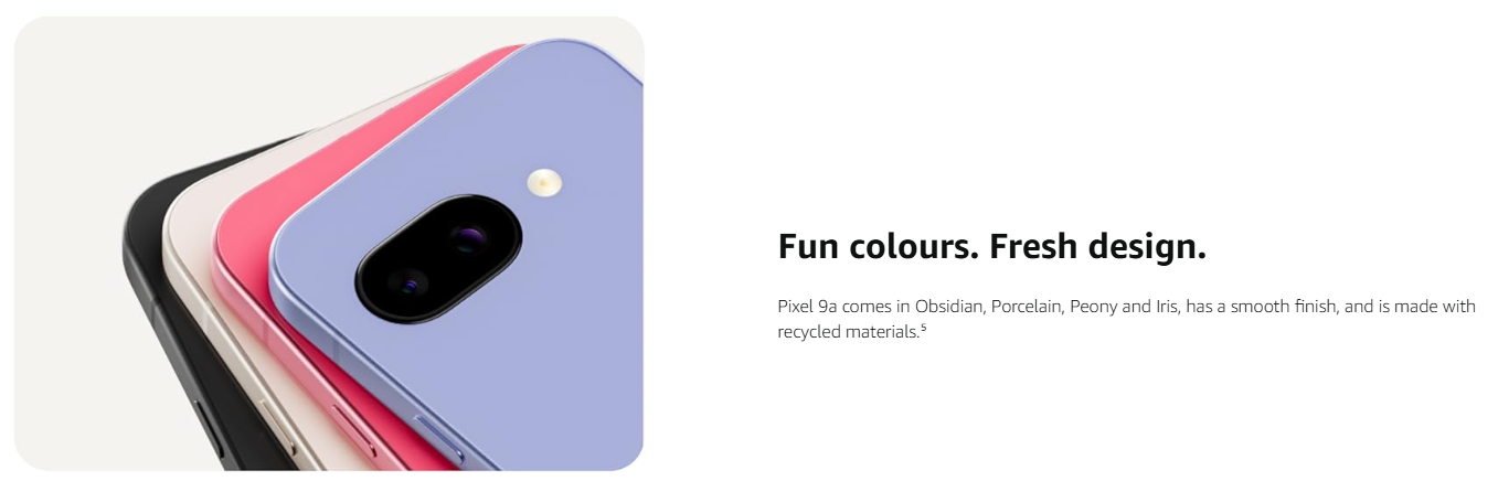 • Fun colours. Fresh design. Pixel 9a comes in Obsidian, Porcelain, Peony and Iris, has a smooth finish, and is made with recycled materials.