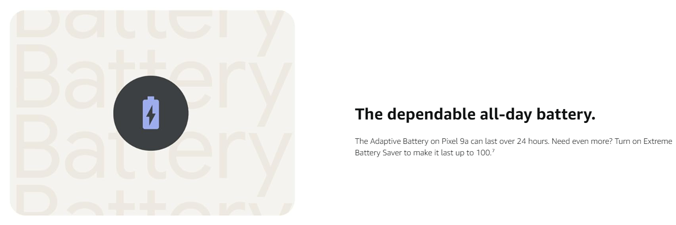 • The dependable all-day battery. The Adaptive Battery on Pixel 9a can last over 24 hours. Need even more? Turn on Extreme Battery Saver to make it last up to 100.