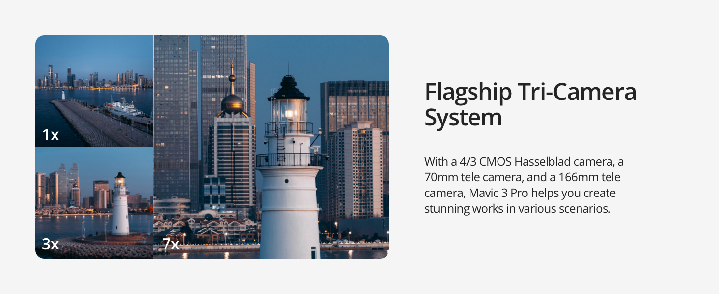 - Medium Tele Camera - Mavic 3 Pro camera drone has a 1/1.3-inch CMOS, 70mm equivalent, 3x Optical Zoom, f/2.8, 48 MP; 1/2-inch CMOS Tele Camera 166mm equivalent, 7x Optical Zoom, 28x Hybrid Zoom, f/3.4, 12 MP.