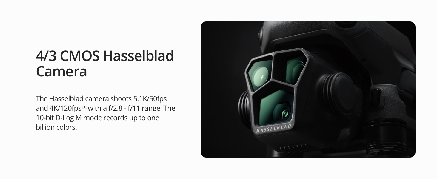 - Hasselblad Main Camera - Mavic 3 Pro has a 4/3 CMOS sensor, 24mm format equivalent, f/2.8-f/11, 20 MP. The Hasselblad 4K drone camera supports shooting RAW photos with a dynamic range of up to 12.8 stops.