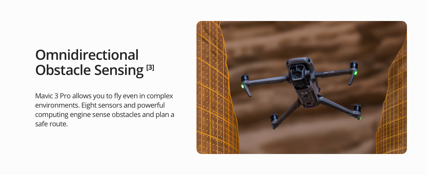 - Omnidirectional Obstacle Sensing and APAS 5.0 - Mavic 3 Pro ensures you fly safely and create with peace of mind. Eight vision sensors work with a vision computing engine to sense obstacles.