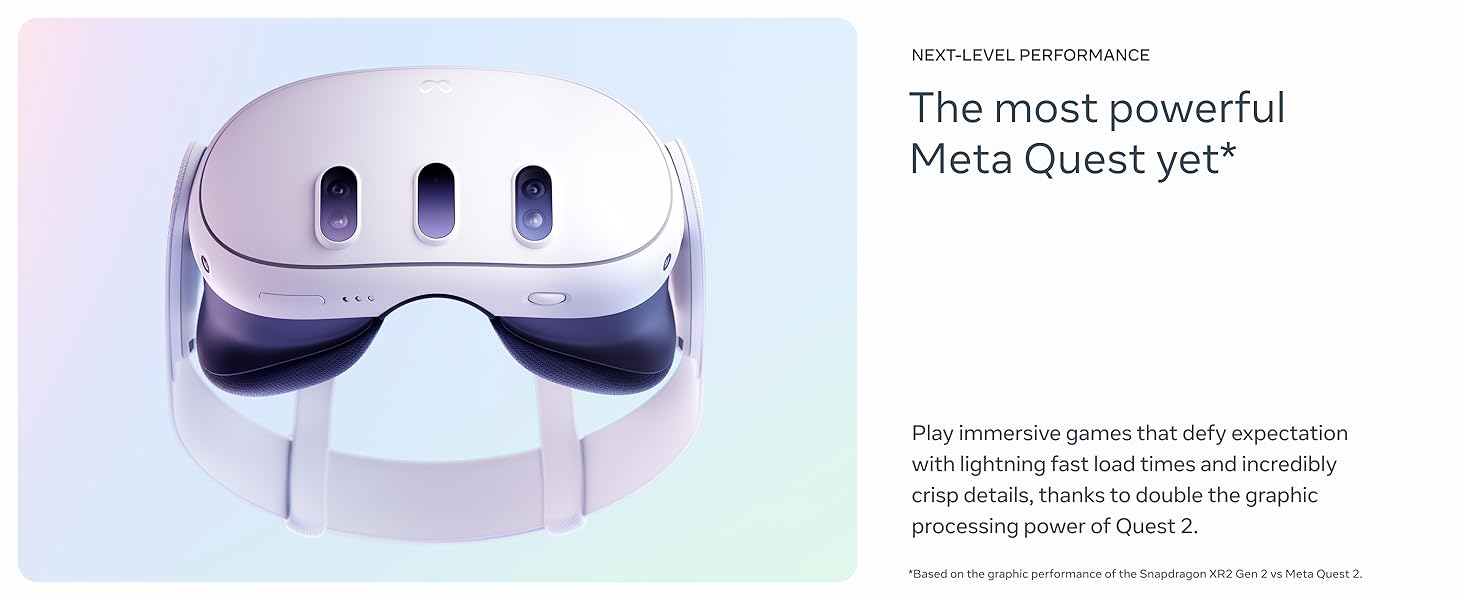 • It’s the most powerful Quest yet*, featuring next-level performance with more than double the graphic processing power of Quest 2. (*Based on the graphic performance of the Snapdragon XR2 Gen 2 vs Meta Quest 2.)