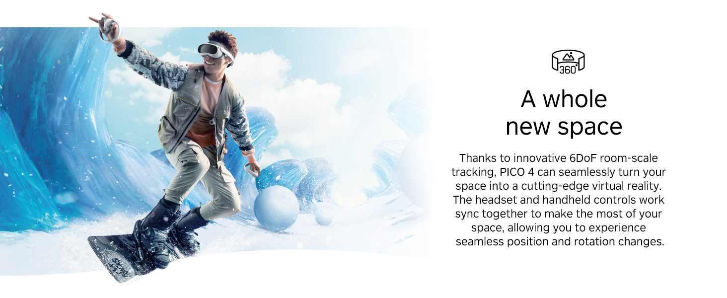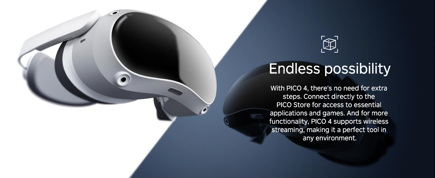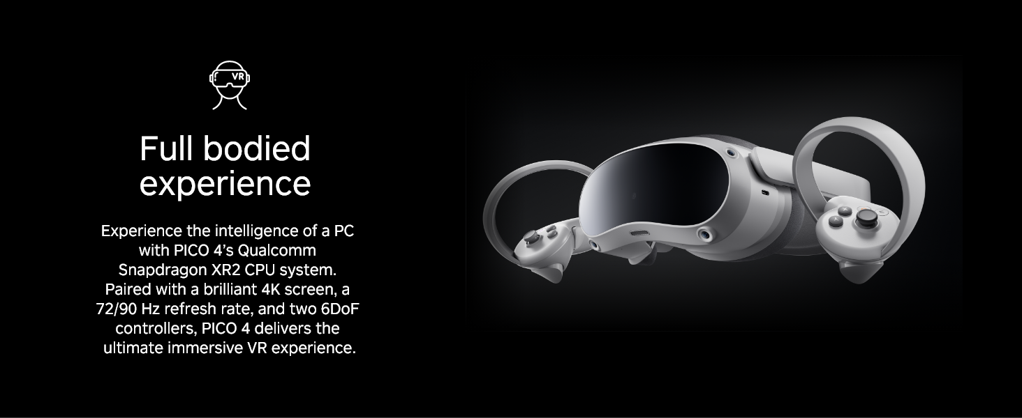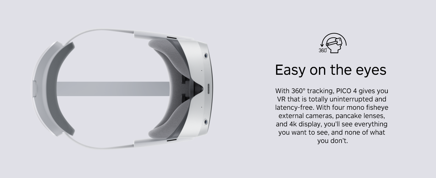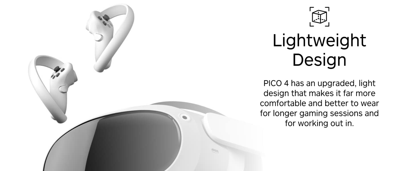 • Balanced design, easy to wear - The balanced design means that the weight of the PICO 4 is evenly distributed to the front and the rear. The result is a superbly comfortable fit.