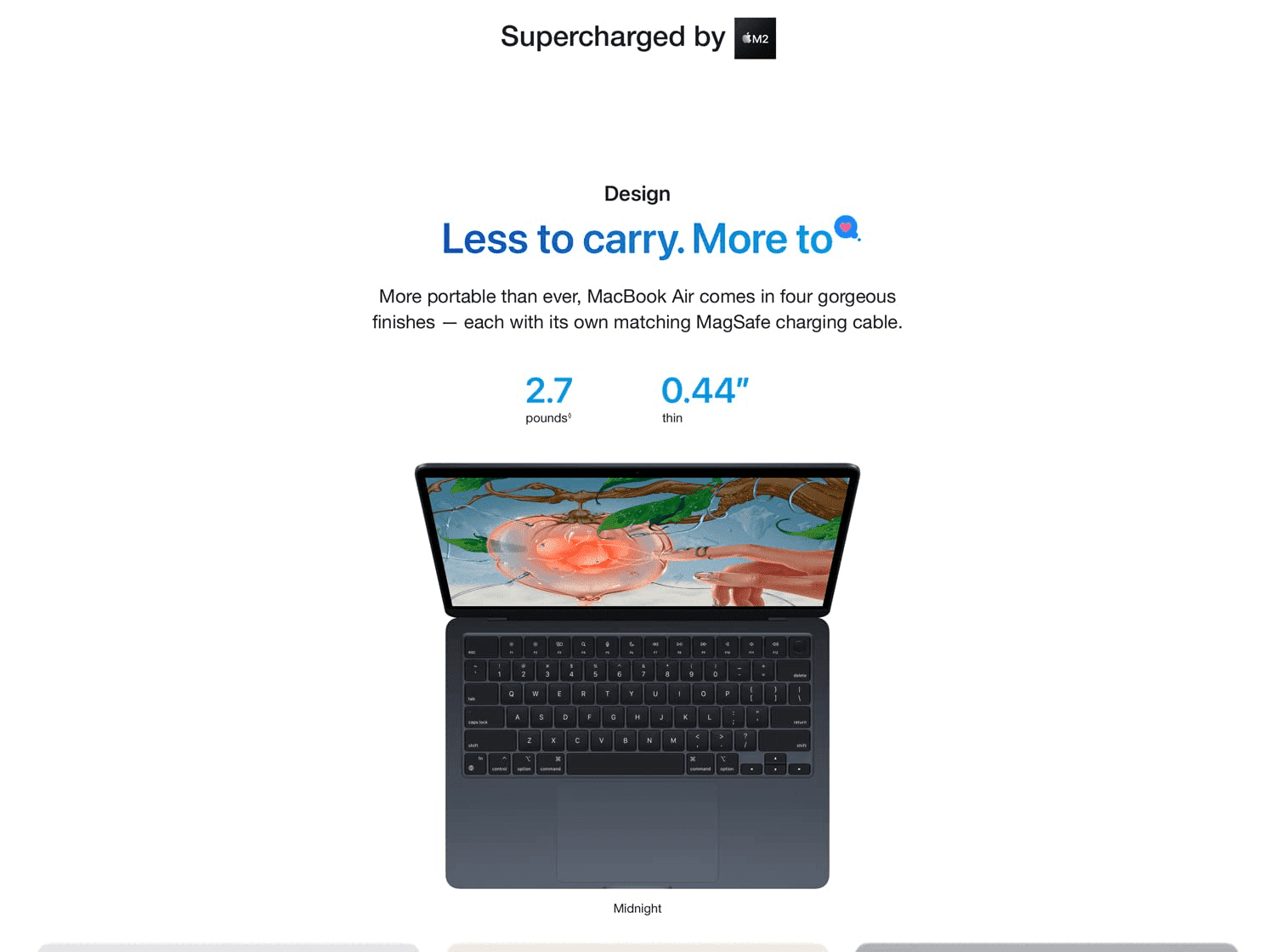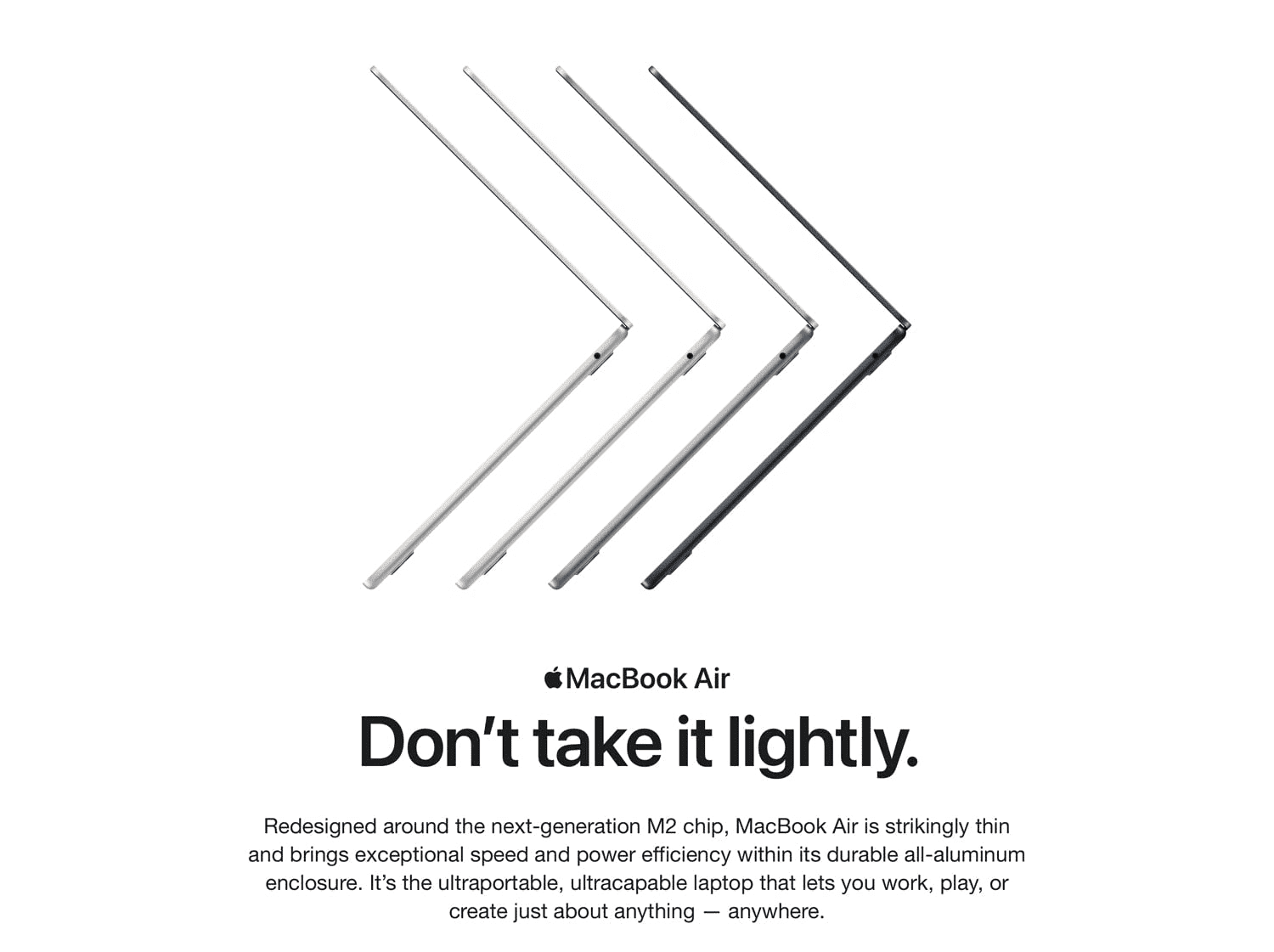• STRIKINGLY THIN DESIGN — The redesigned MacBook Air is more portable than ever and weighs just 1.24 kilograms. It’s the incredibly capable laptop that lets you work, play or create just about anything — anywhere.