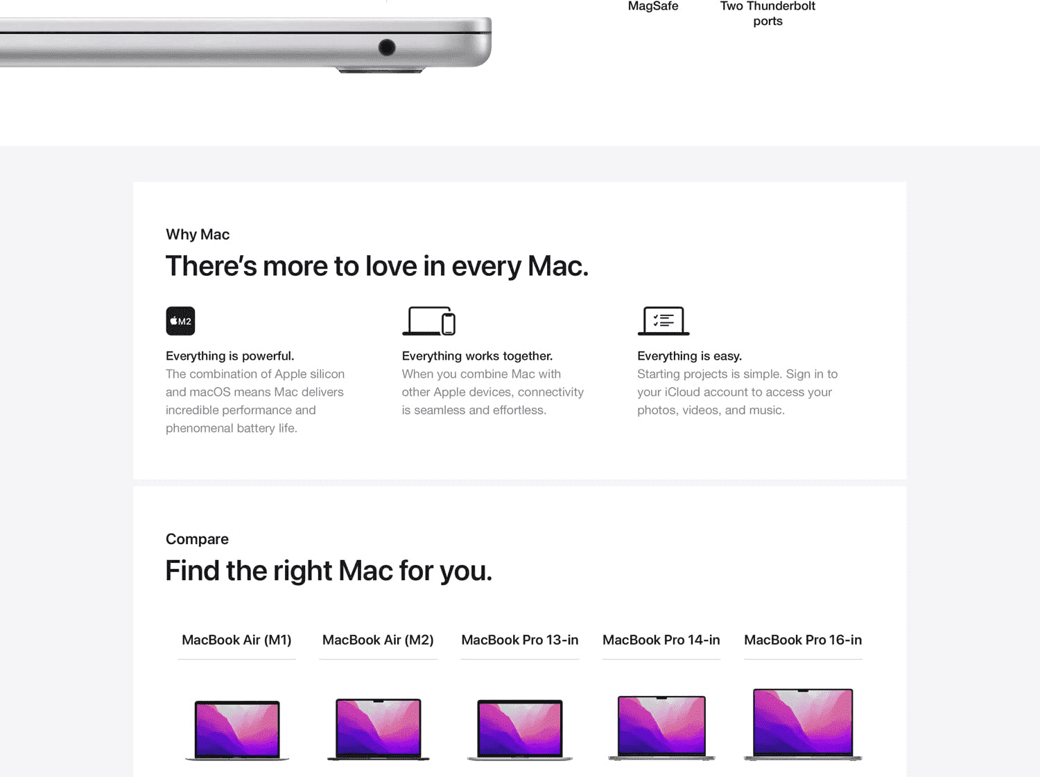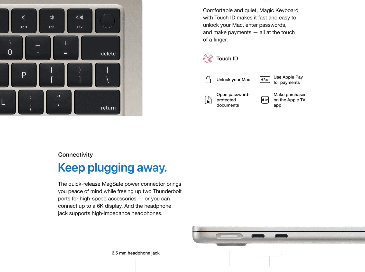 • VERSATILE CONNECTIVITY — MacBook Air features a MagSafe charging port, two Thunderbolt ports and a headphone jack.