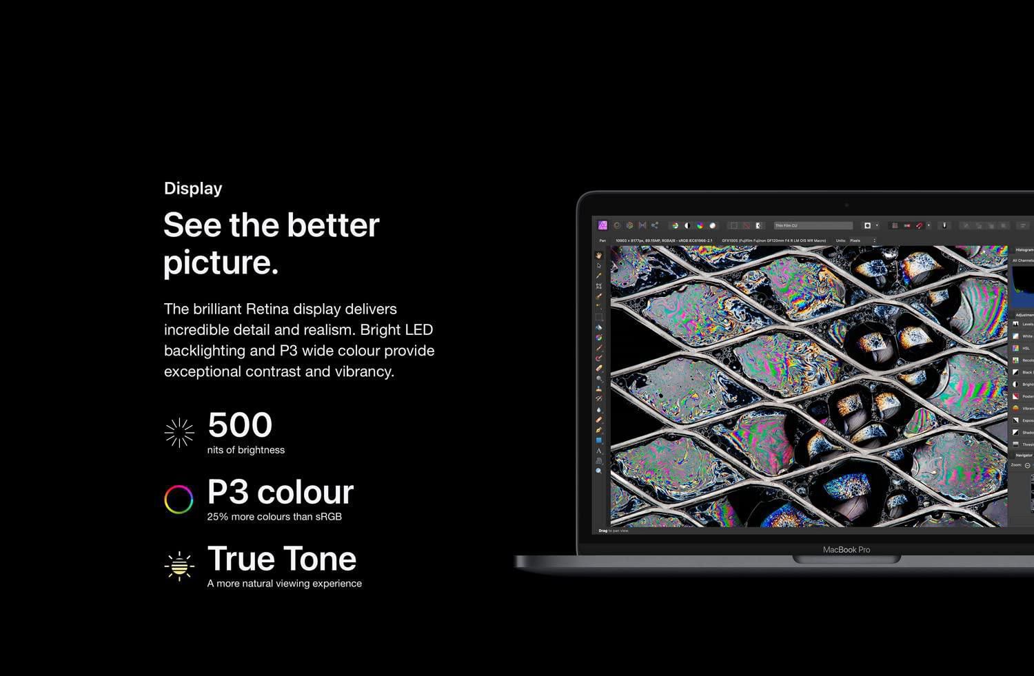 • BRILLIANT DISPLAY — The 13.3-inch Retina display features 500 nits of brightness and P3 wide colour for vibrant images and incredible detail.