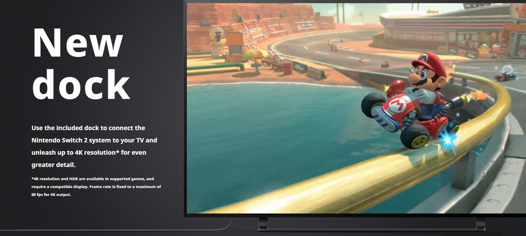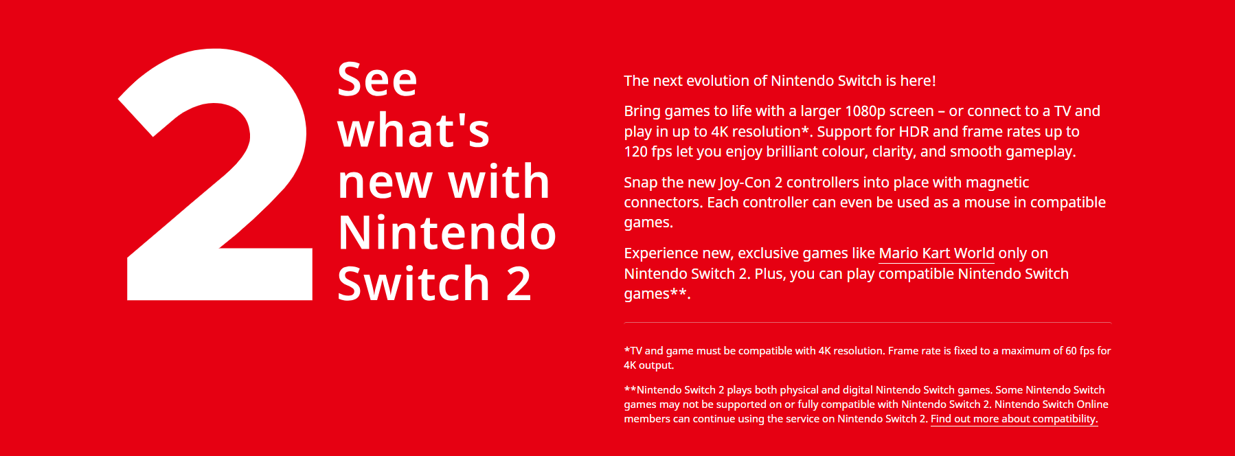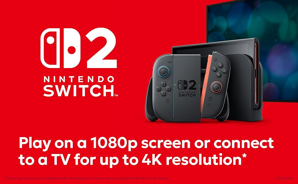 • **TV and game must be compatible with 4K resolution. Frame rates are capped at 60 fps for 4K output. ***Additional games, systems and/or accessories may be required for multiplayer mode. Internet, Nintendo Switch Online membership and Nintendo Account required for online features, including GameChat. Nintendo Switch 2 camera or compatible USB-C camera required for video features. Not available in all countries. Terms and GameChat requirements apply. Games, systems, membership, and some accessories sold separately.