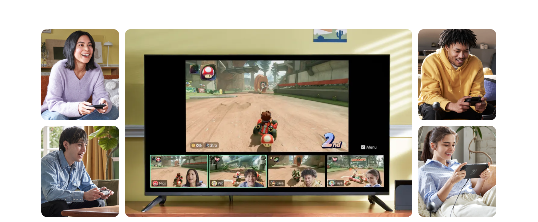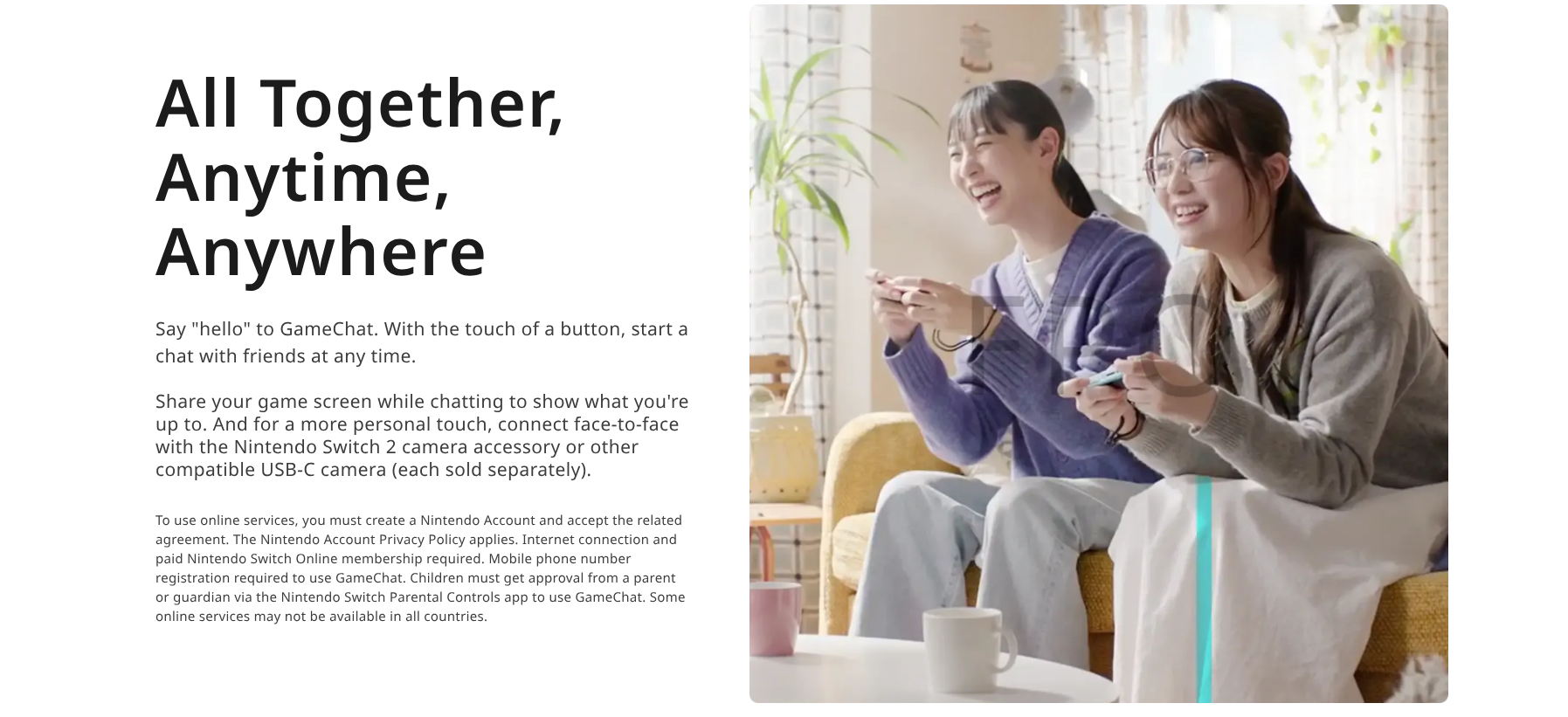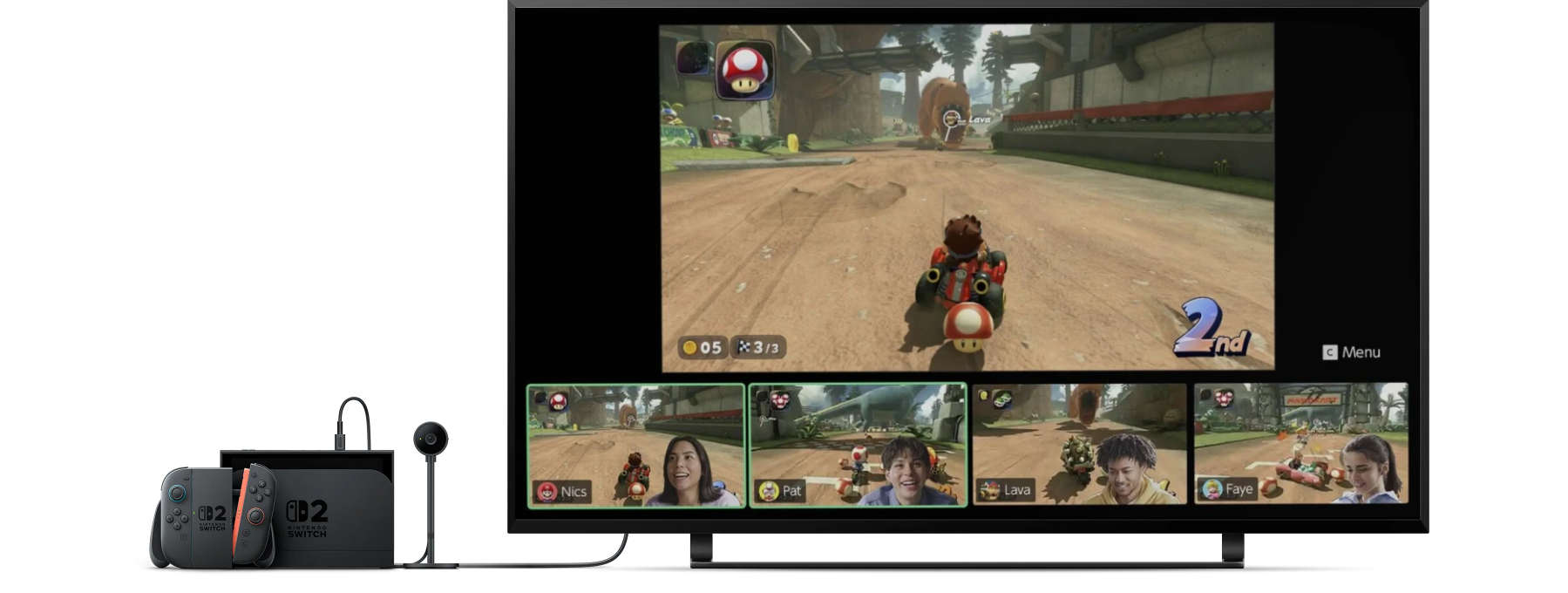 • Share your game screen while chatting to show what you're up to. And for a more personal touch, connect face-to-face with the Nintendo Switch 2 camera or other compatible USB-C camera (each sold separately). *Some Nintendo Switch games may not be supported or fully compatible with Nintendo Switch 2.