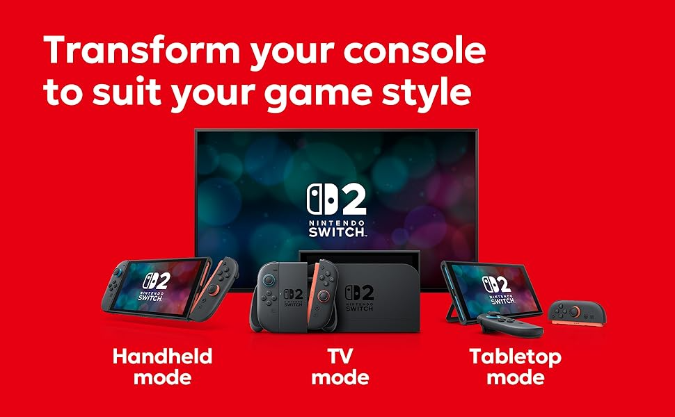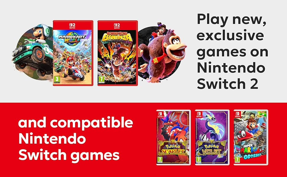 • Experience new, exclusive games like Mario Kart World only on Nintendo Switch 2. Plus, you can enjoy compatible games from your Nintendo Switch library*. Bring games to life with a larger 1080p screen—or connect to a TV and play in up to 4K resolution**. Support for HDR, VRR, and frame rates up to 120 fps let you enjoy vivid colour, clarity, and smooth gameplay.