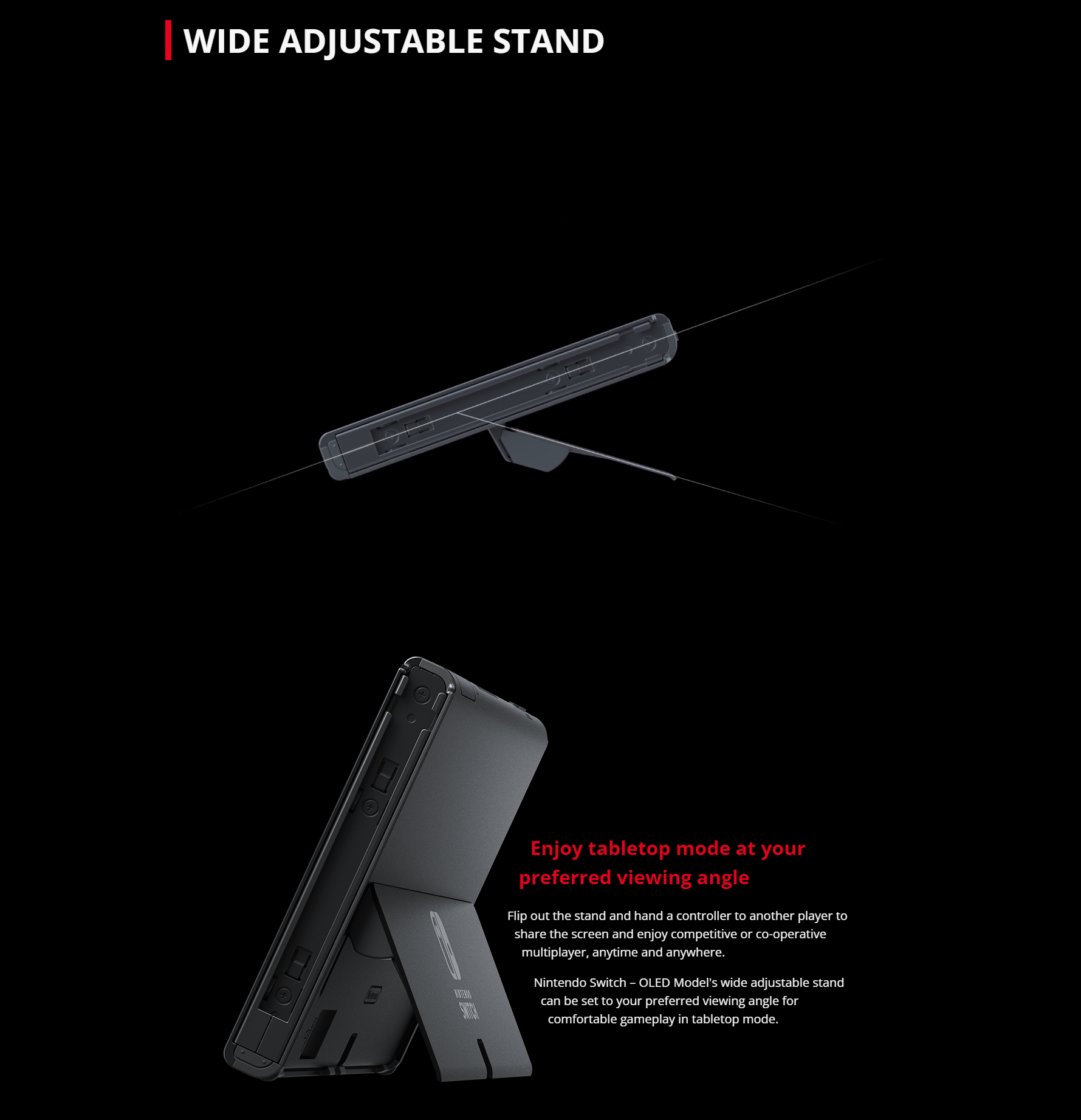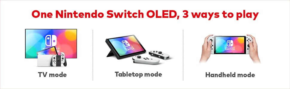 • Flip out the stand and hand a controller to another player to share the screen and enjoy competitive or co-operative multiplayer, anytime and anywhere. Nintendo Switch (OLED model)'s wide adjustable stand can be set to your preferred viewing angle for comfortable gameplay in tabletop mode.