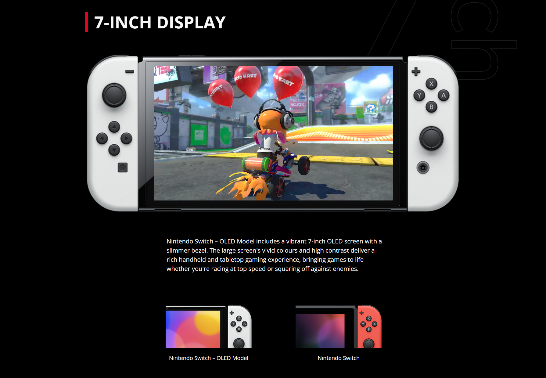 • Pick it up and play with the Joy-Con controllers attached. Nintendo Switch (OLED model) includes a vibrant 7-inch OLED screen with a slimmer bezel. The large screen's vivid colours and high contrast deliver a rich handheld and tabletop gaming experience, bringing games to life whether you're racing at top speed or squaring off against enemies.