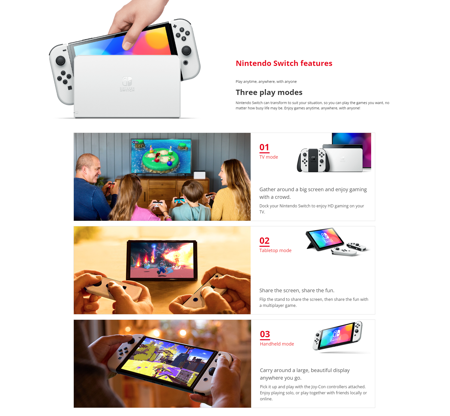 • Play anytime, anywhere, with anyone. Nintendo Switch can transform to suit your situation, so you can play the games you want, no matter how busy life may be.
