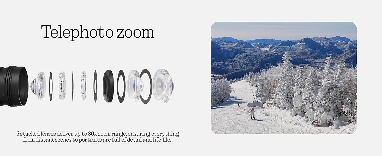 • CAMERA: 50MP OIS main camera, 50MP Telephoto camera, and 8 MP Ultra-wide camera. Replay life’s best moments with a versatile camera that consistently delivers true-to-life results. With a 0.6x to 30x zoom range, it captures every light and shadow in stunning detail, from wherever you are. FRONT CAMERA: 32 MP for ultra-clear selfies or group shots.
