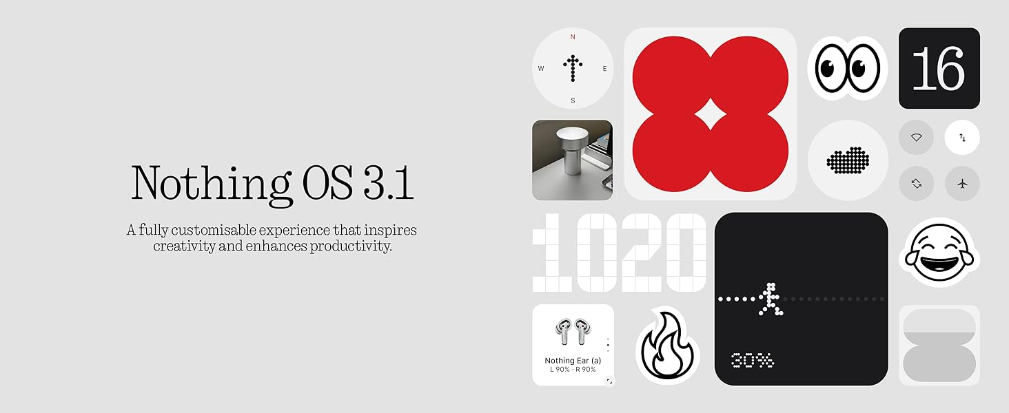 • NOTHING OS 3.1: Effortlessly intuitive and rooted in functional customisation. Adjust Quick Settings, home screen, and lock screen with custom shortcuts and widgets to enhance your experience. Activate Smart Drawer, and watch your apps automatically organize by category, with your most used apps displayed at the top. Less time searching and more time doing.