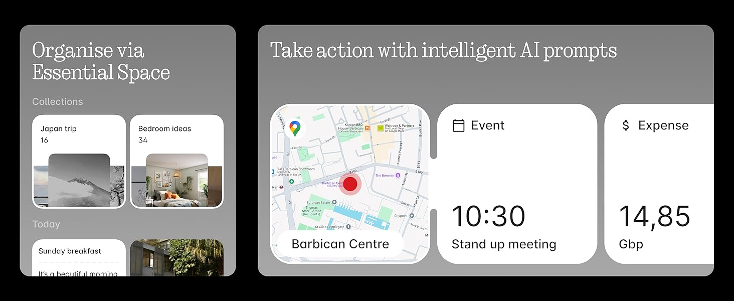 • ESSENTIAL KEY: A new button on the side of your device. Press once to capture the content on your screen. Or long-press to record your voice, ideas and inspirations on the go. ESSENTIAL SPACE: Everything in one place. It removes the friction from recalling content. AI organizes your captures and generates personalized suggestions and actions to help you stay on top of things.