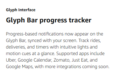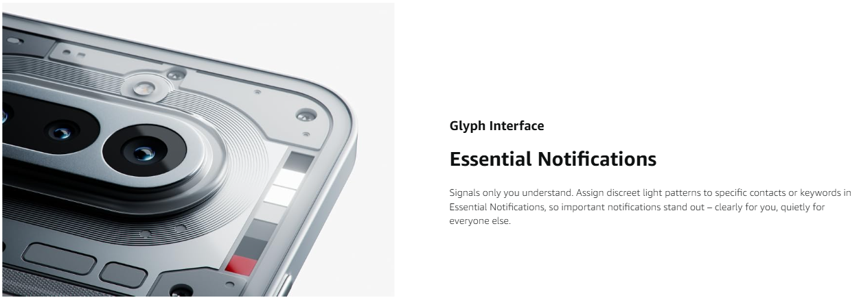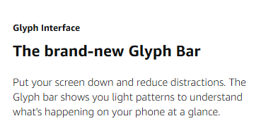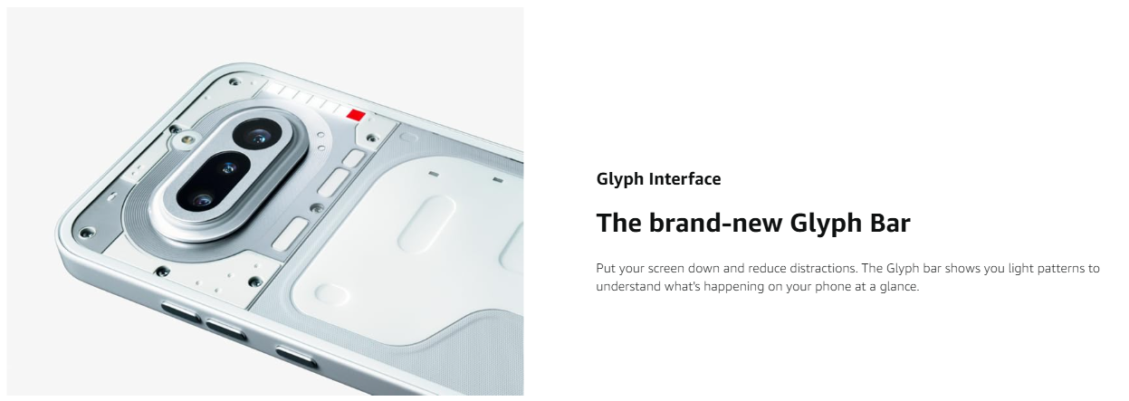 • GLYPH BAR: Put your screen down and reduce distractions. Understand what’s happening on your smartphone at a glance through the Glyph Bar with light patterns and sounds. Made with 63 precision mini-LEDs