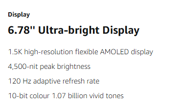 • DISPLAY: 6.78 Inch 1.5K high-resolution flexible AMOLED display. The adaptive refresh rate dynamically shifts between 30 Hz to 120 Hz for fluid motion while saving power.