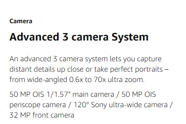 • CAMERA: An advanced 3-camera system, from ultra-wide 0.6x to 70x ultra zoom, lets you capture distant details up close or take portrait-perfect shots with 3.5x optical zoom. The super-wide 32 MP front camera is designed to capture larger groups.