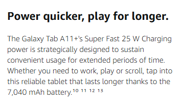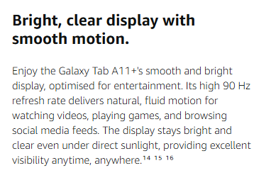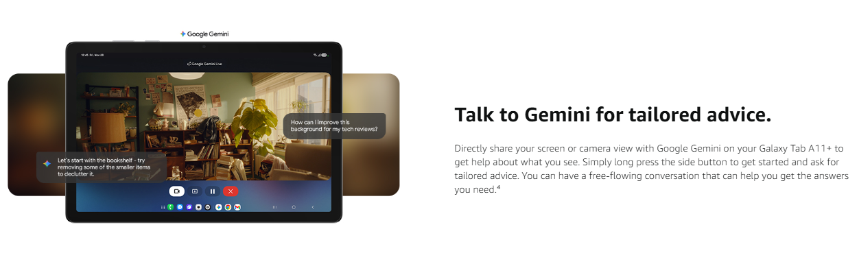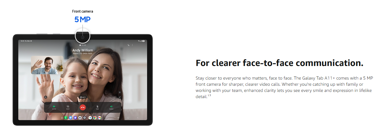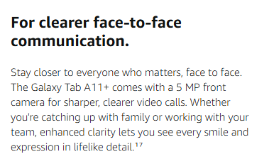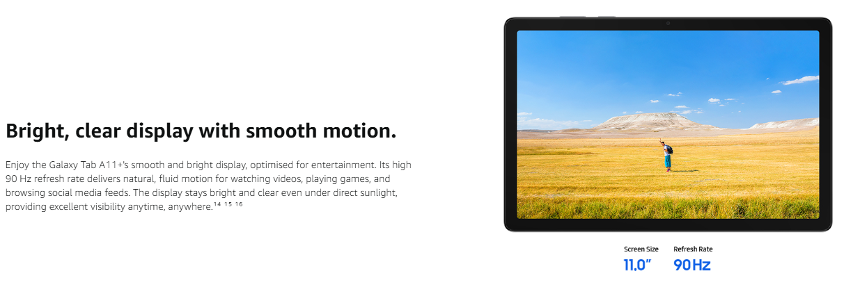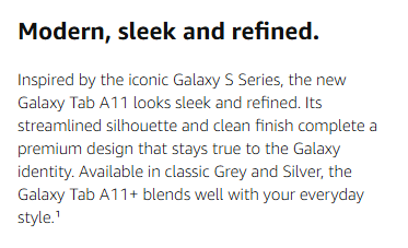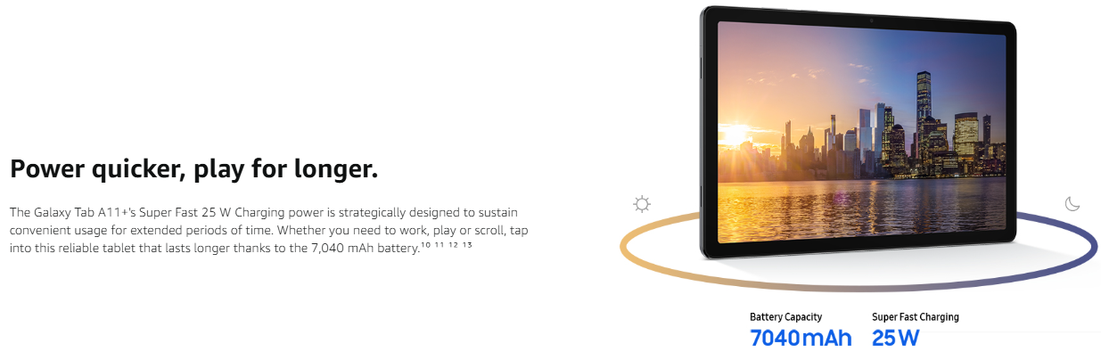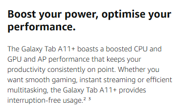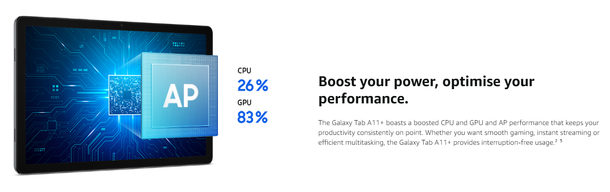 • MODERN, SLEEK, POWERFUL: Galaxy Tab A11+ has a boosted CPU and GPU for consistently optimal performance; Whether for work or play, you can experience interruption-free usage. With a streamlined silhouette, clean finish and a complete premium design