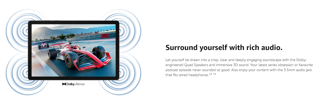 • AN IMMERSIVE EXPERIENCE: The Galaxy Tab A11+ features Dolby-engineered Quad Speakers that deliver a rich audio; Soak up your favourite entertainment with the 3D sound or plug into the 3.5mm audio jack and enjoy your content with wired headphones