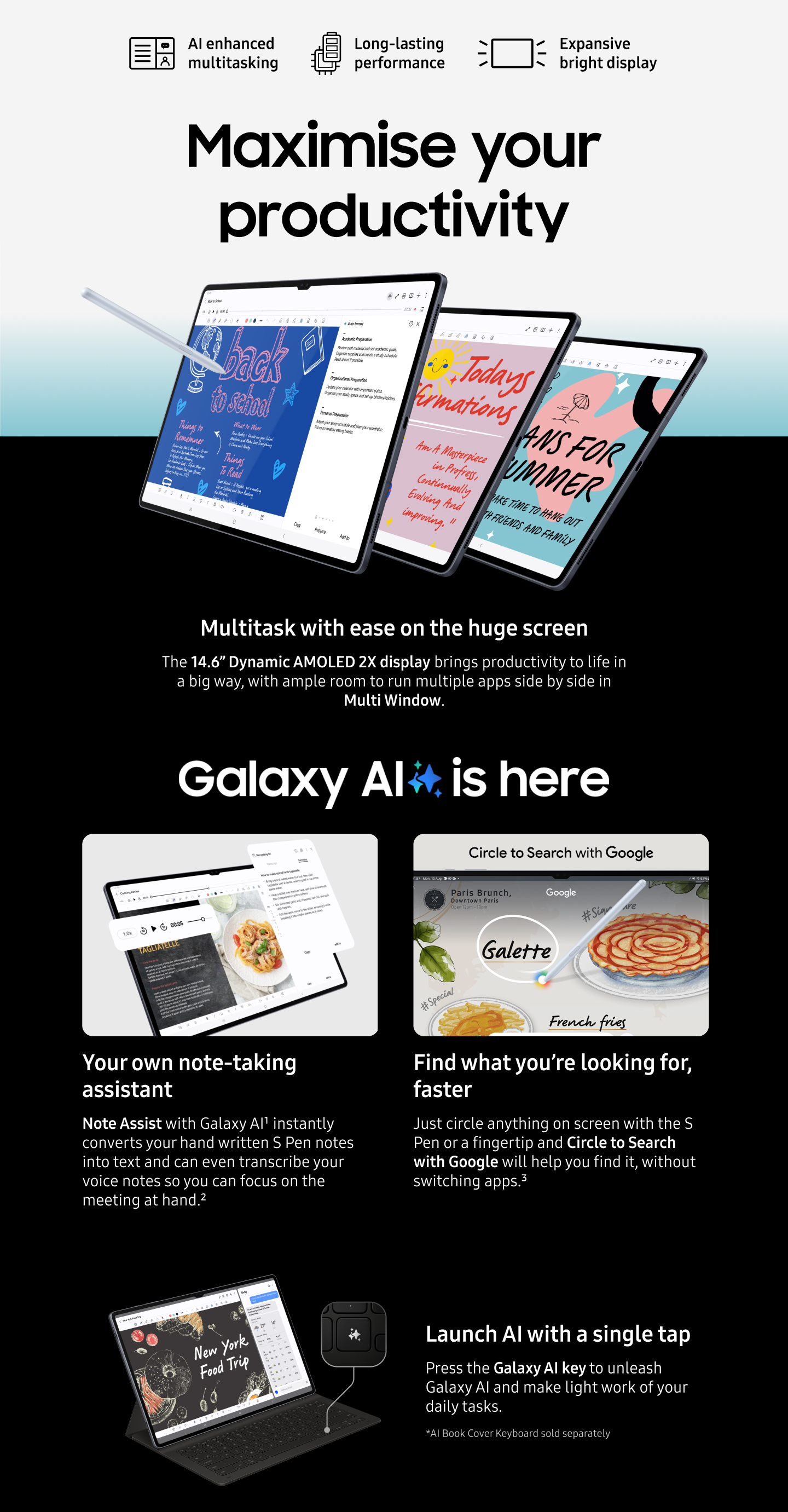 • Embrace brilliance on an expansive screen: Samsung tablet with Dynamic AMOLED 2X display, Anti-reflection technology and Vision Booster for optimal viewing in any light
